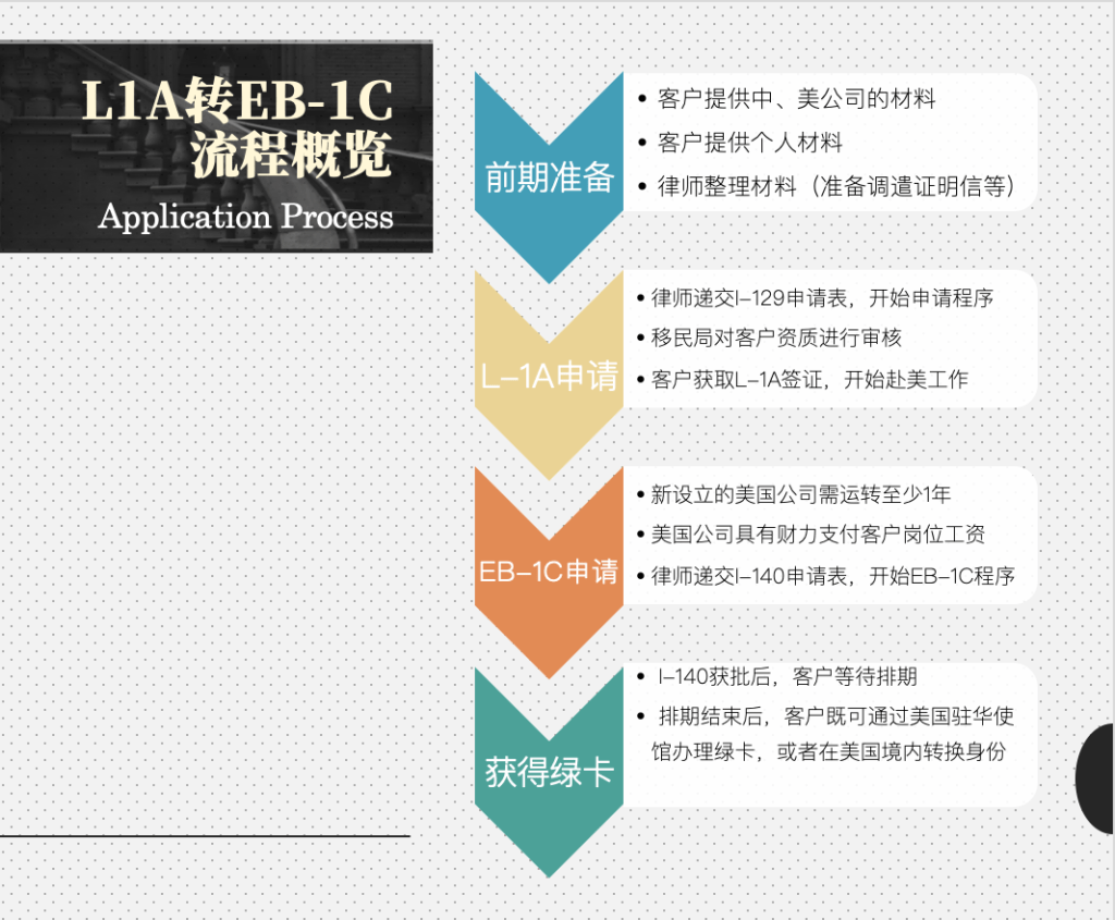 - 申请EB-1C的流程:企业既可以在L-1A的基础上提交EB-1C申请,也可以在没有申请过L-1A的情况下直接申请EB-1C。开始申请时,企业需递交I-140表格,获批后开始绿卡排期,等到排期结束后申请绿卡(或通过美国驻华使馆办理,或在美国境内直接身份转换)。